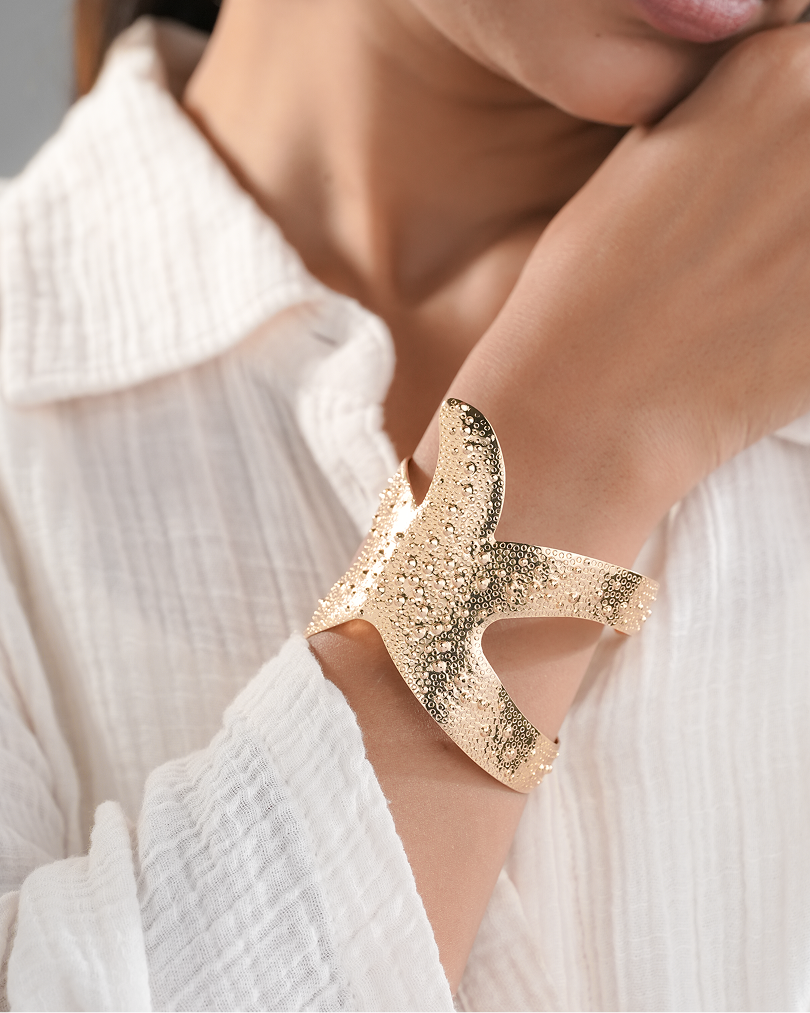 Dive into bold coastal charm with the Auric Starfish cuff by Zukiie Jewels. Sculpted in the silhouette of a starfish with glimmering textured details, this statement piece captures the spirit of ocean treasures and sunlit shores.