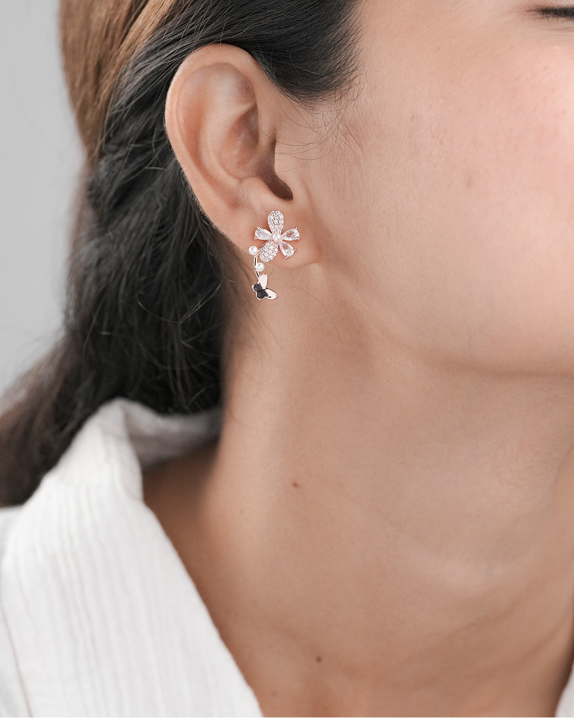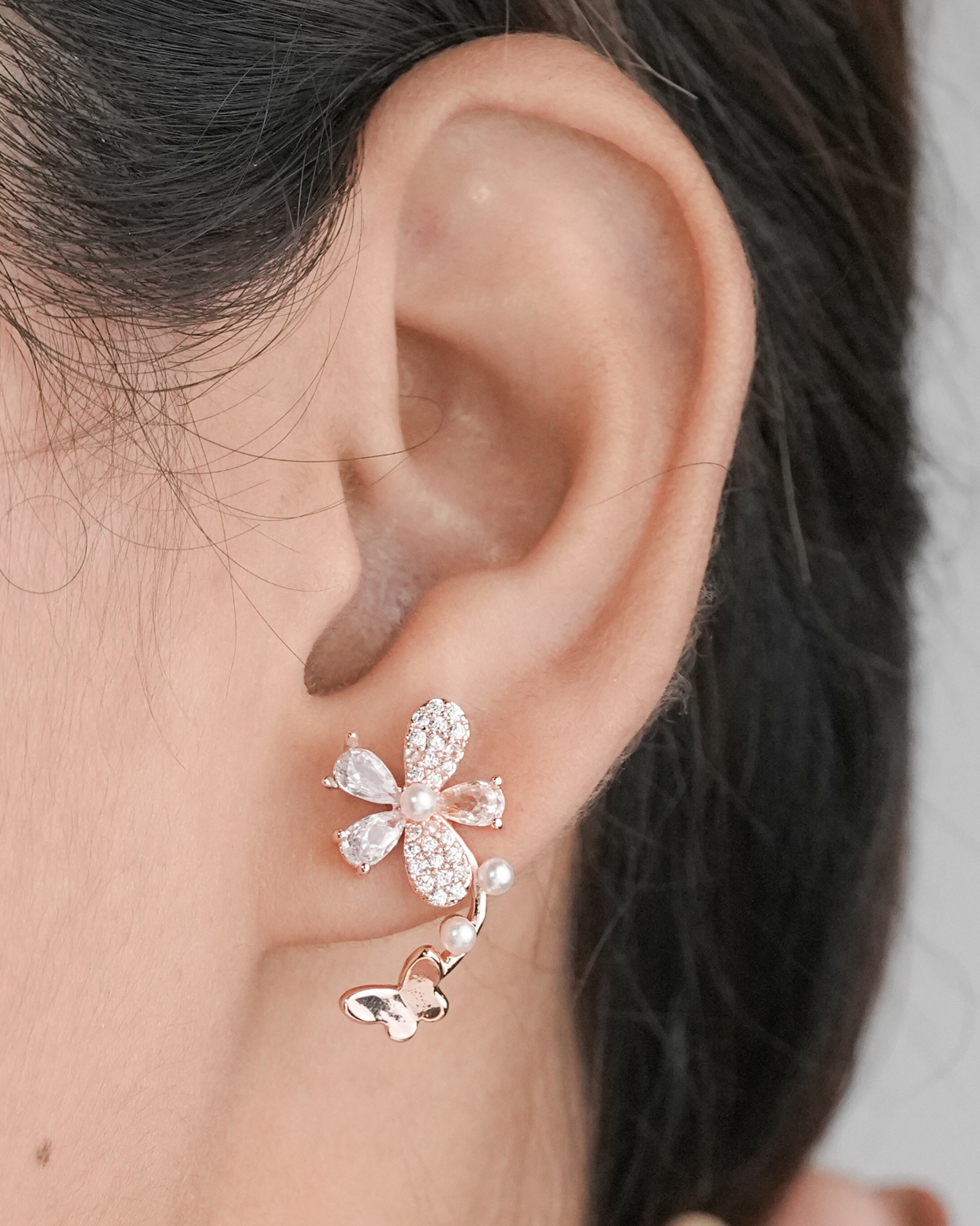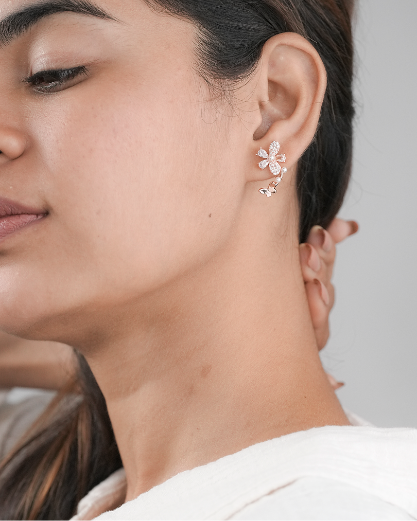 The Butterfly Bloom Earrings by Zukiie Jewels are whimsical and radiant, showcasing a sparkling floral stud with teardrop crystals, dainty pearls, and a graceful butterfly drop. This enchanting design adds a dreamy elegance to any ensemble.