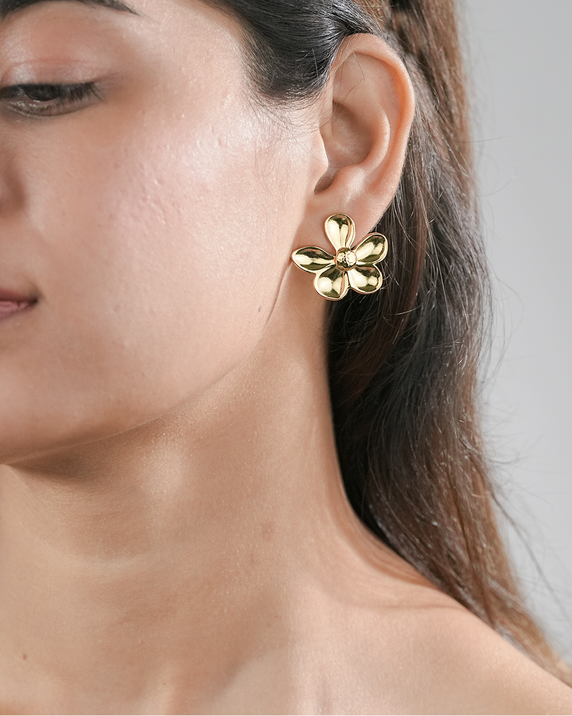 These playful floral studs are all about fun, flair, and femininity. Shaped like bold golden blossoms with smooth petals and a textured center, Bloomie adds a touch of joy to your everyday style. Lightweight yet striking, they’re made for women who love to bloom in their way.