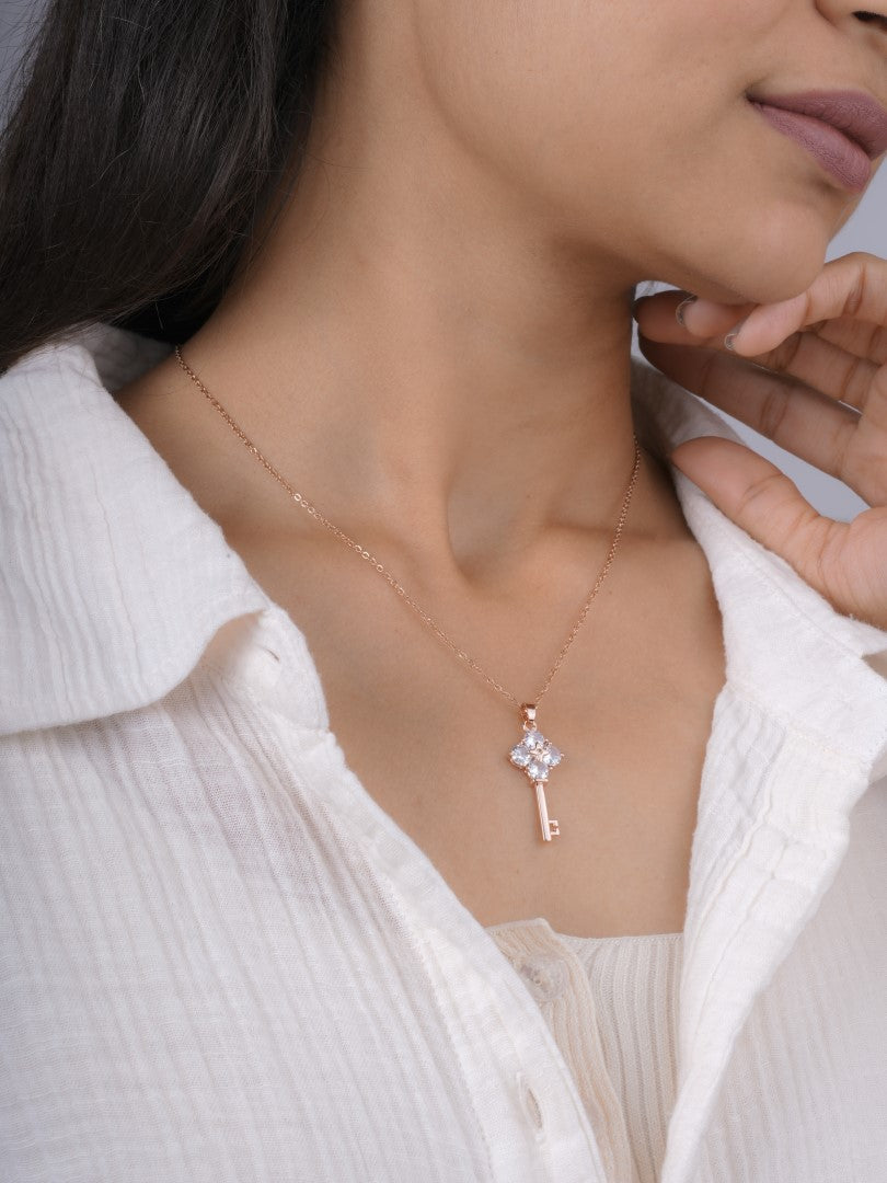 Unlock elegance with the Celestial Key pendant — a delicate rose gold design crowned with sparkling stones, blending timeless charm with a touch of modern magic.