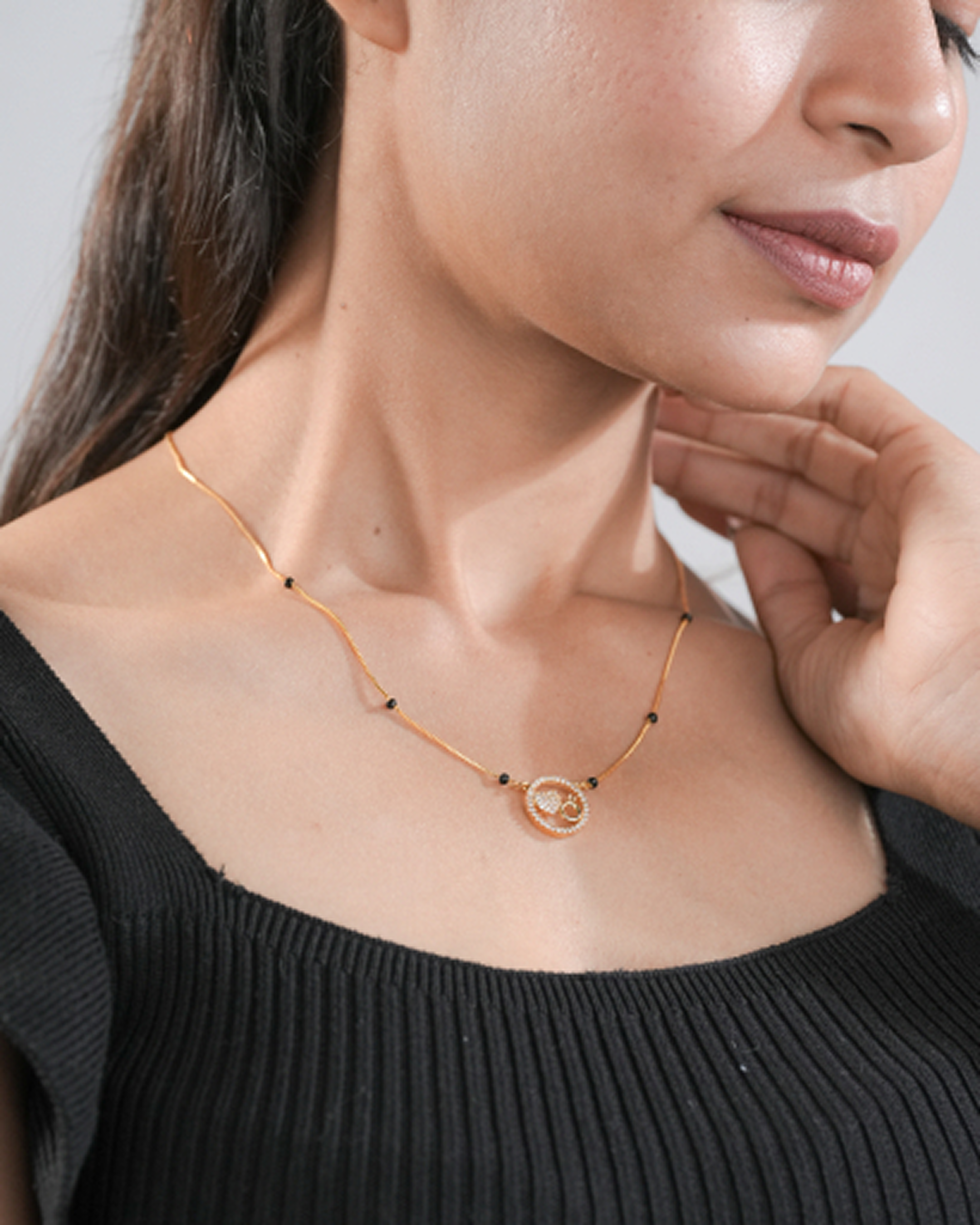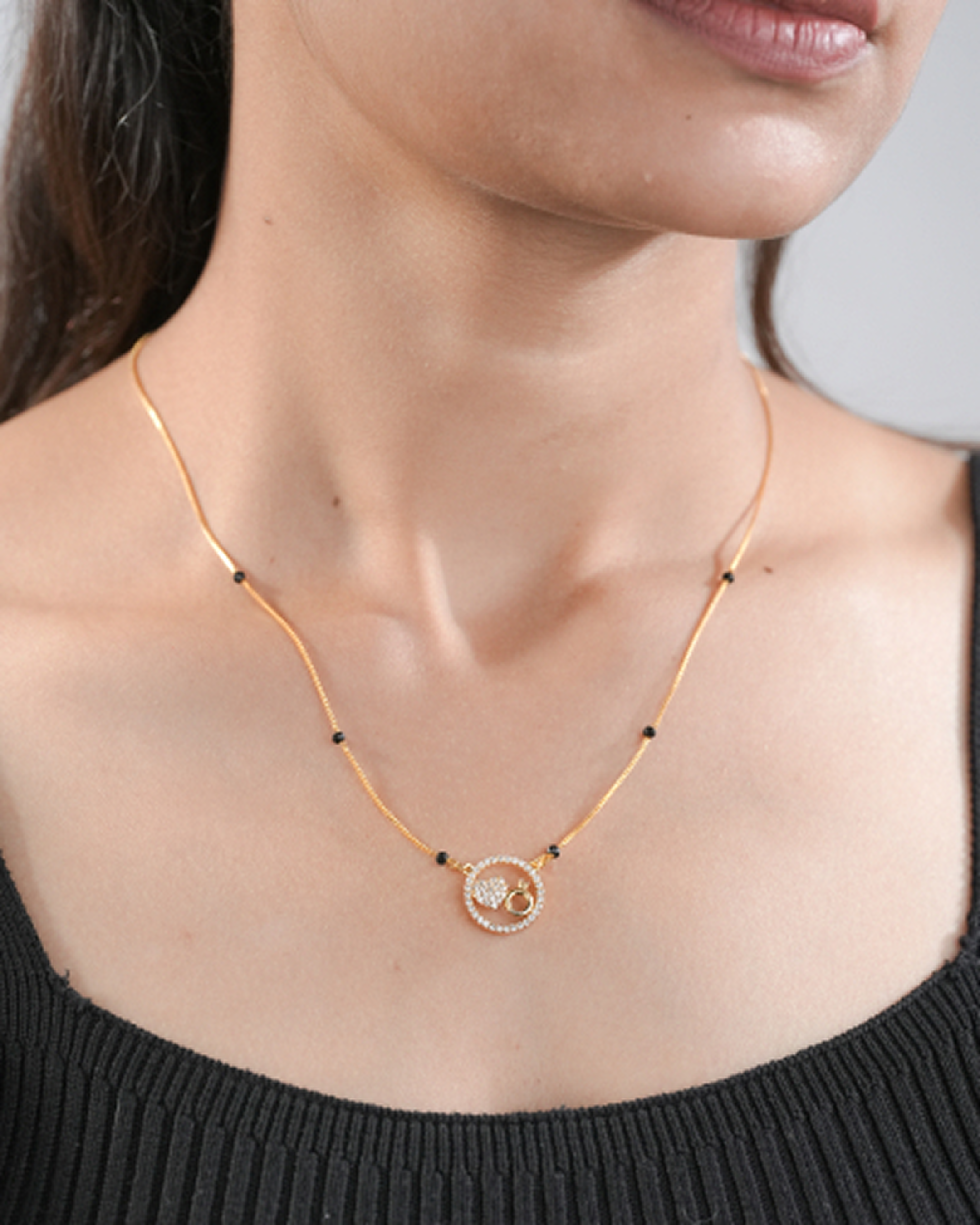 Celebrate the forever promise with the Heart Love Mangalsutra-featuring a sparkling heart and solitaire ring within a delicate circular frame. A modern symbol of romance, connection, and commitment.