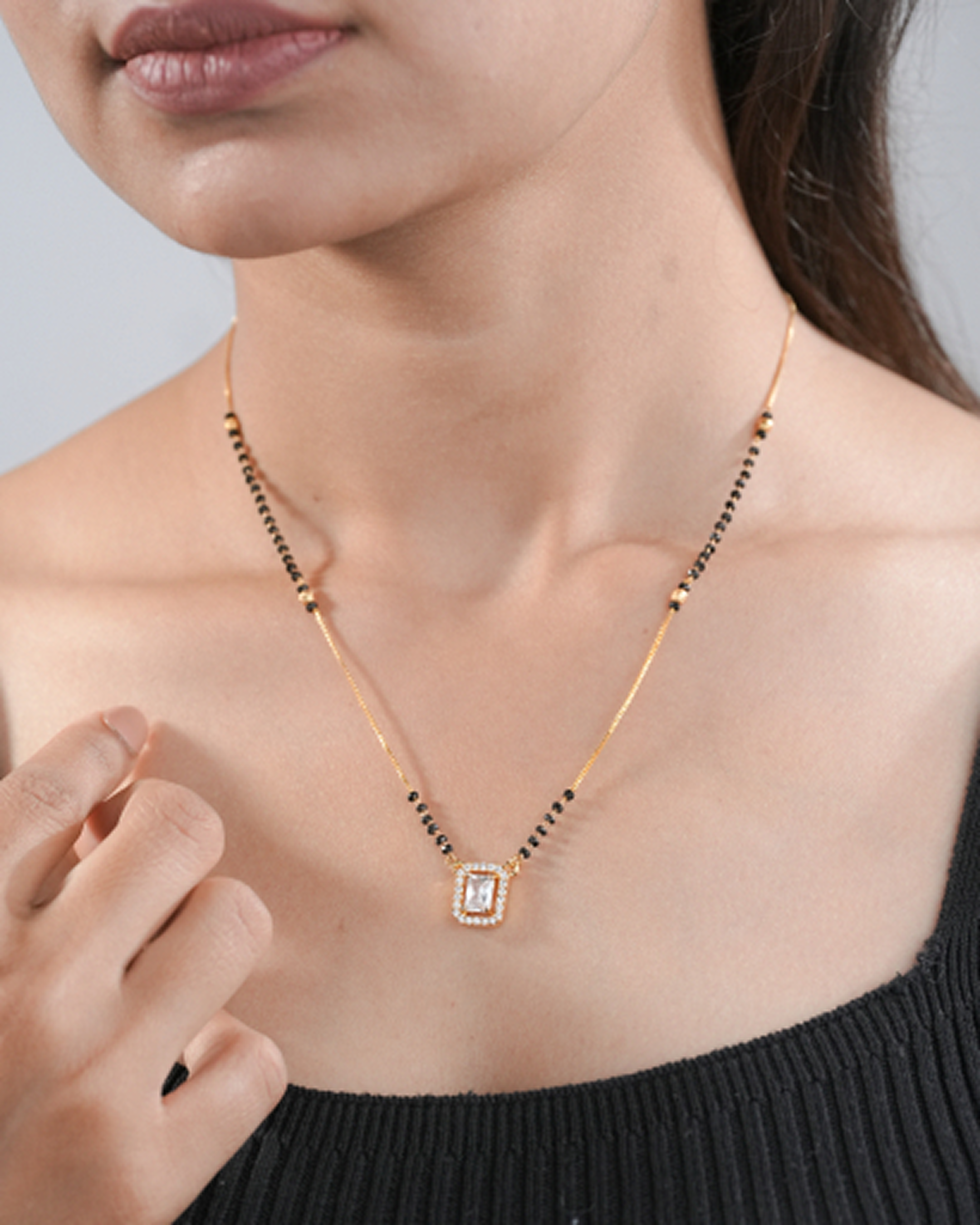 A timeless classic for the modern bride. The Zarik Mangalsutra features a rectangular solitaire centerpiece embraced by a sparkling halo a perfect blend of tradition and elegance.