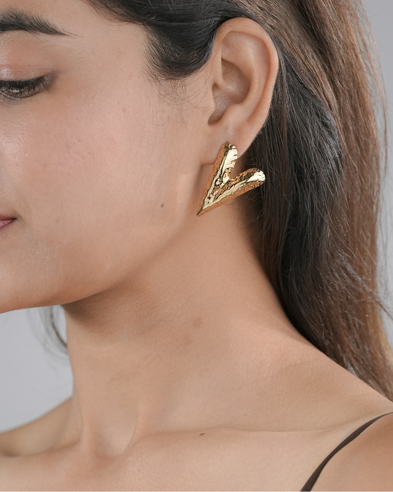 These unique, bold studs are shaped like an abstract heart, crafted in a shiny gold finish with a hammered texture. Designed to stand out, they add instant charm and attitude to your look. Lightweight and stylish, they’re perfect for women who love statement jewellery that’s still easy to wear.