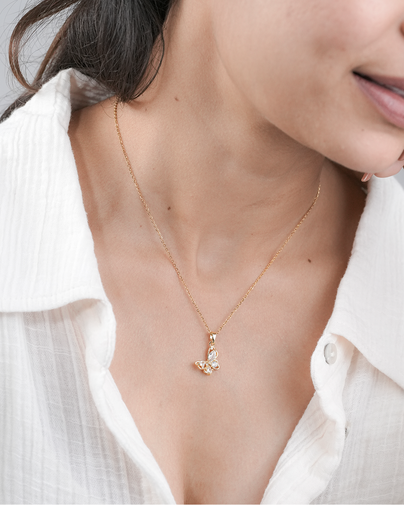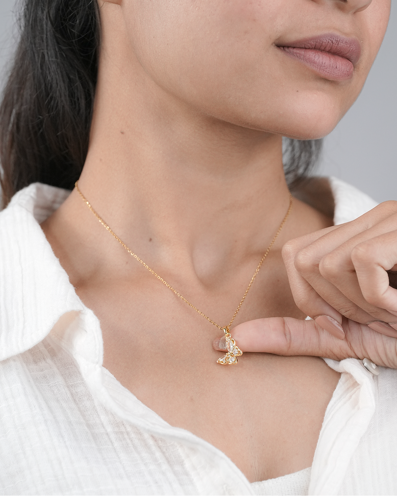 The Twinkalfly Necklace by Zukiie Jewels captures the magical flutter of a butterfly mid-flight. Crafted in gold and adorned with sparkling teardrop crystals, this dainty pendant reflects light with every graceful move.