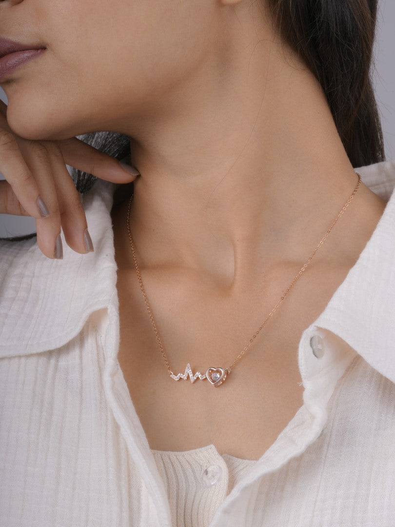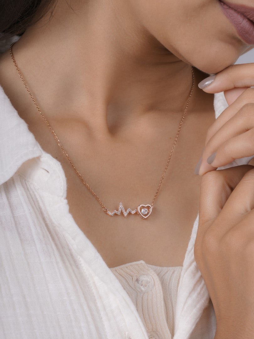 Where love meets life. The Heartbeat Spark Necklace blends a shimmering heartbeat motif with a crystal-studded heart — capturing the rhythm of passion and the beauty of connection.