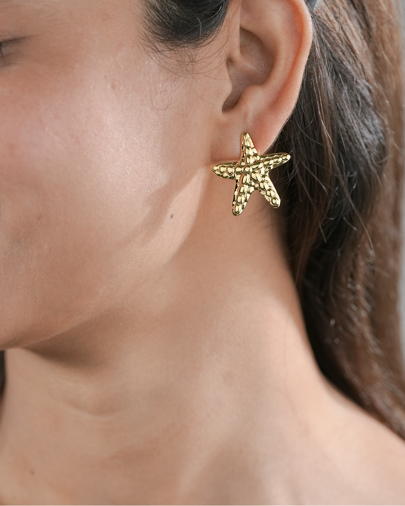 Golden Starlet earrings are shaped like a starfish with a shiny gold finish and a dotted texture. Fun, bold, and lightweight, they add a playful touch to your look.