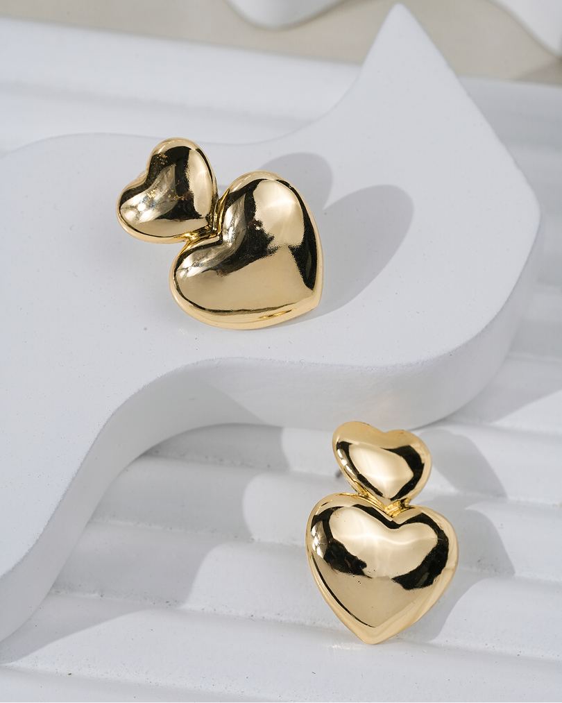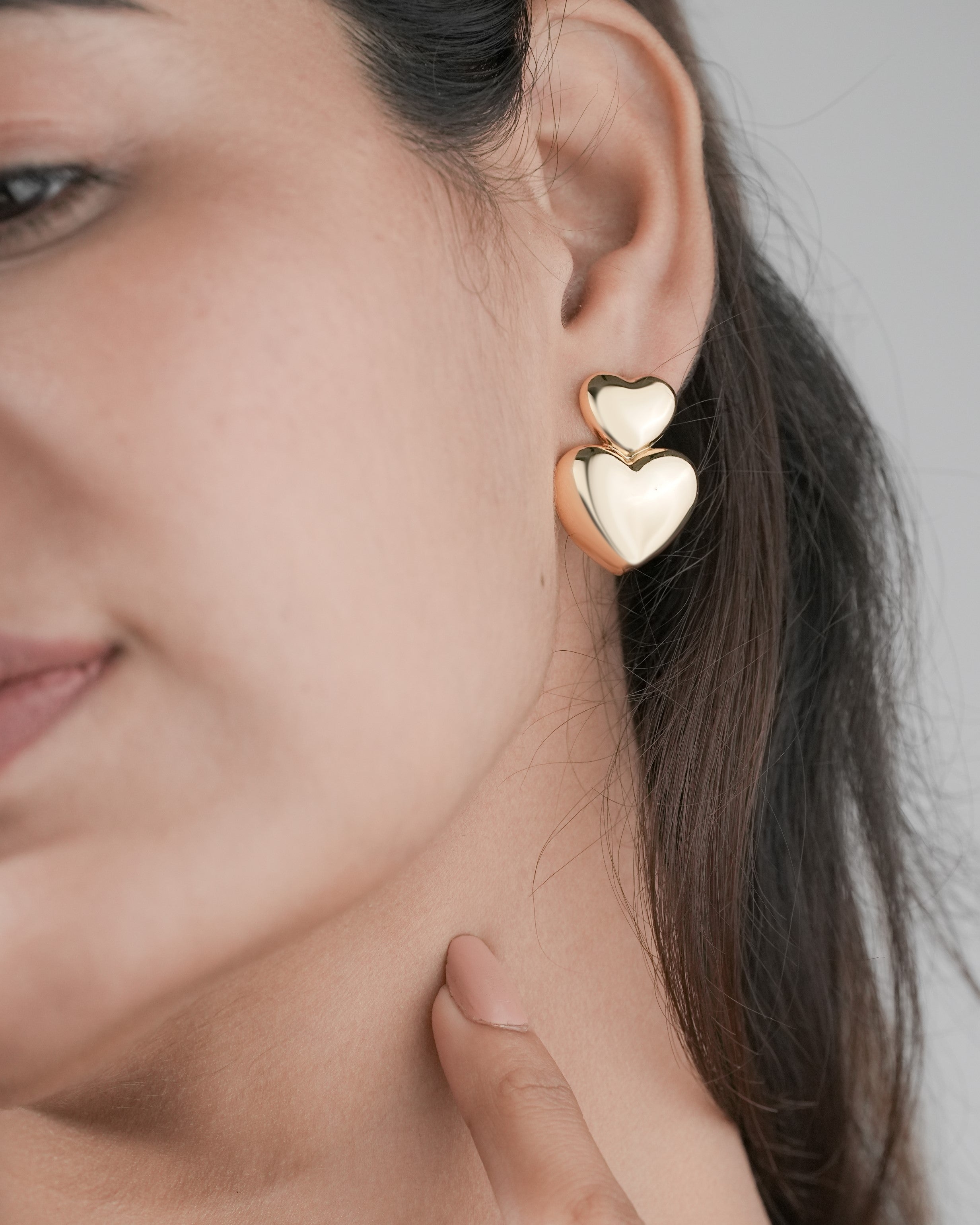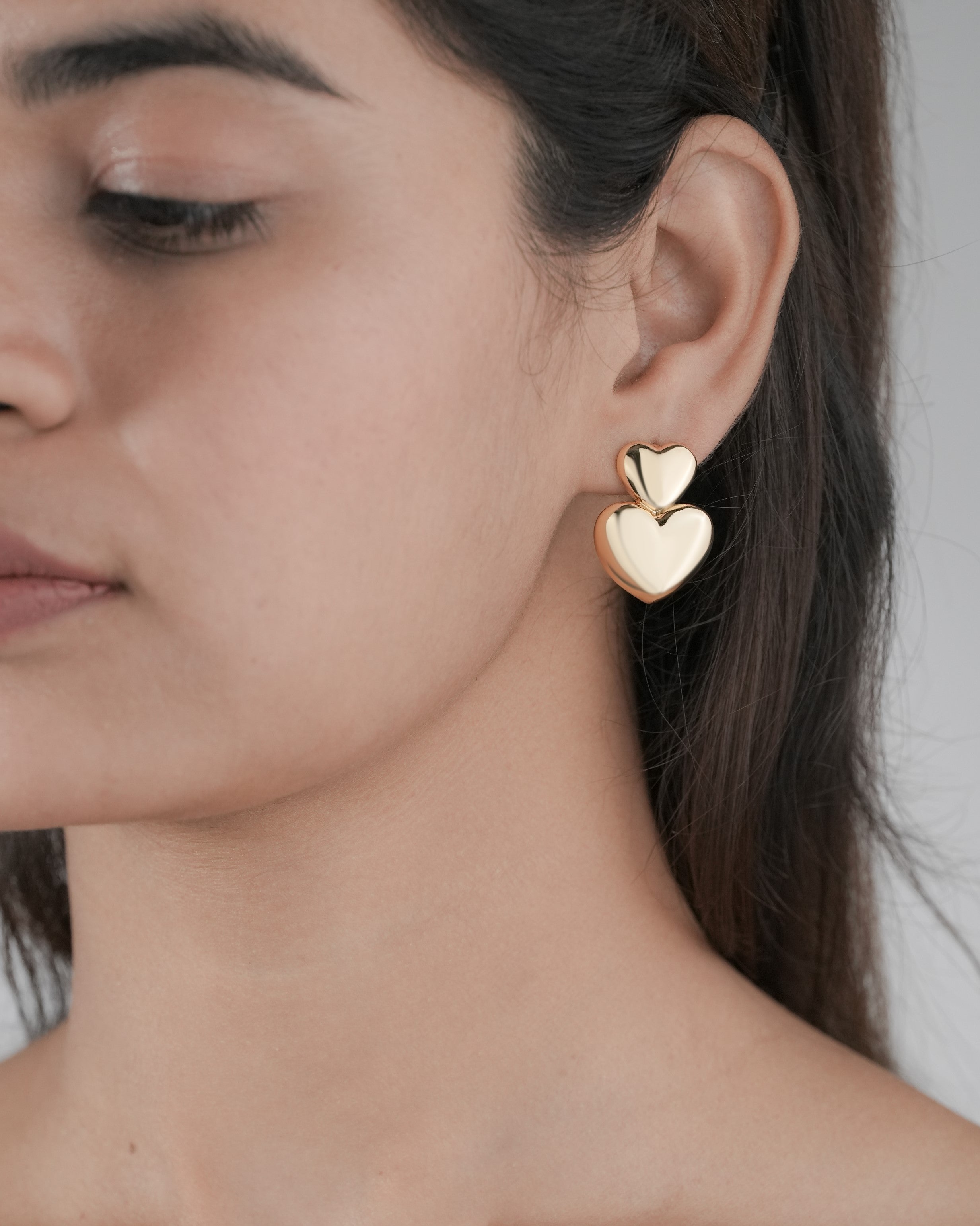 Twin Flame earrings feature two golden hearts joined in a smooth, shiny finish. Their bold yet romantic design adds charm and warmth to any outfit. Light to wear and full of love.