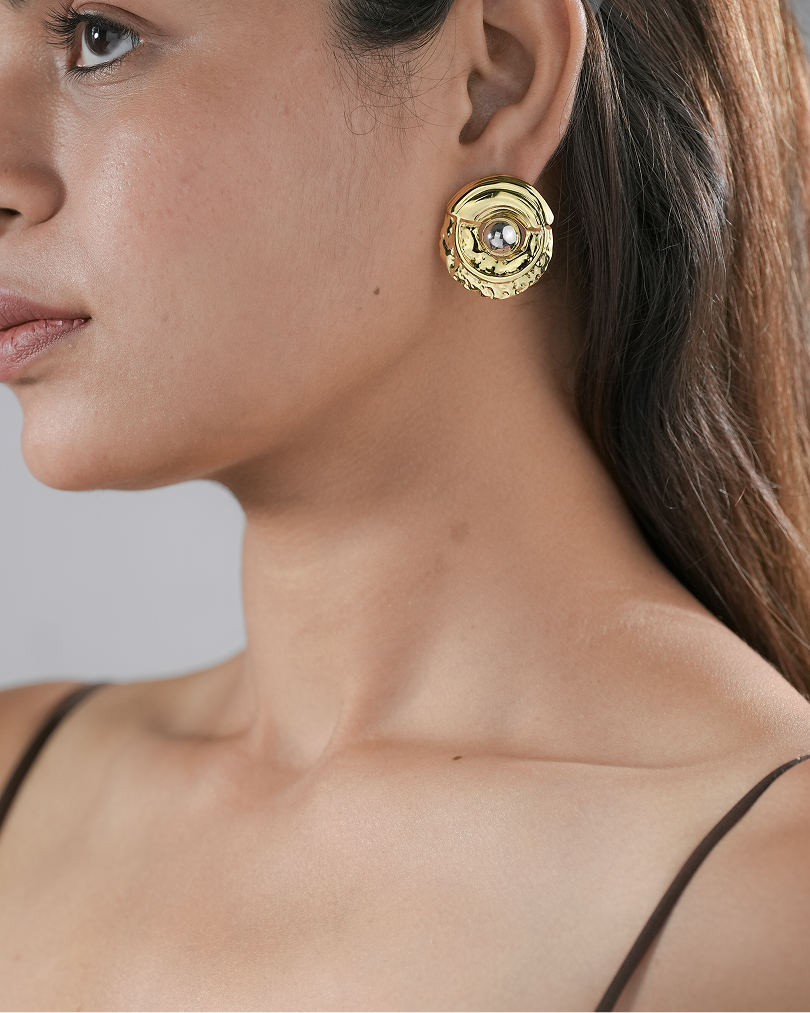 The OrbitGlow Earrings by Zukiie Jewels are a bold cosmic statement, featuring a hammered gold-tone outer ring embracing a gleaming silver orb at the center. These earrings bring together celestial elegance and artistic texture in perfect harmony.