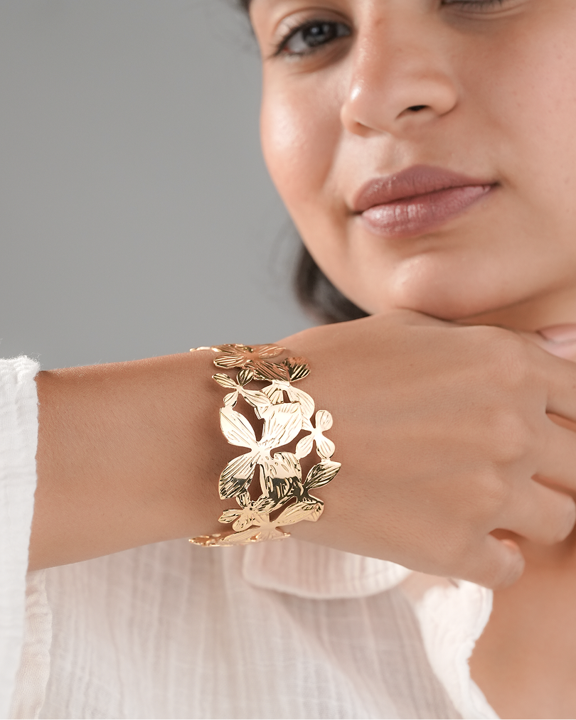 Let this cuff be your garden of glam. Wear it with flowing maxi dresses for a romantic look or contrast it with a tailored outfit for floral-meets-fierce energy. Perfect for brunches, weddings, or anytime you want to blossom with style.