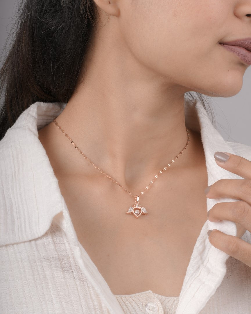 Where romance takes flight. The Wings of Love Necklace features a crystal-studded heart embraced by delicate wings — a graceful emblem of freedom, affection, and everlasting bonds.