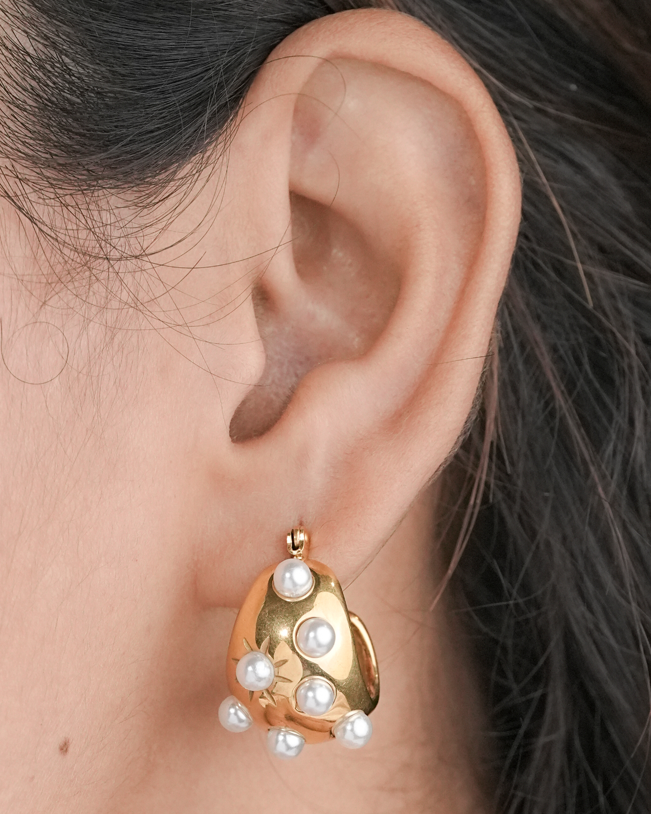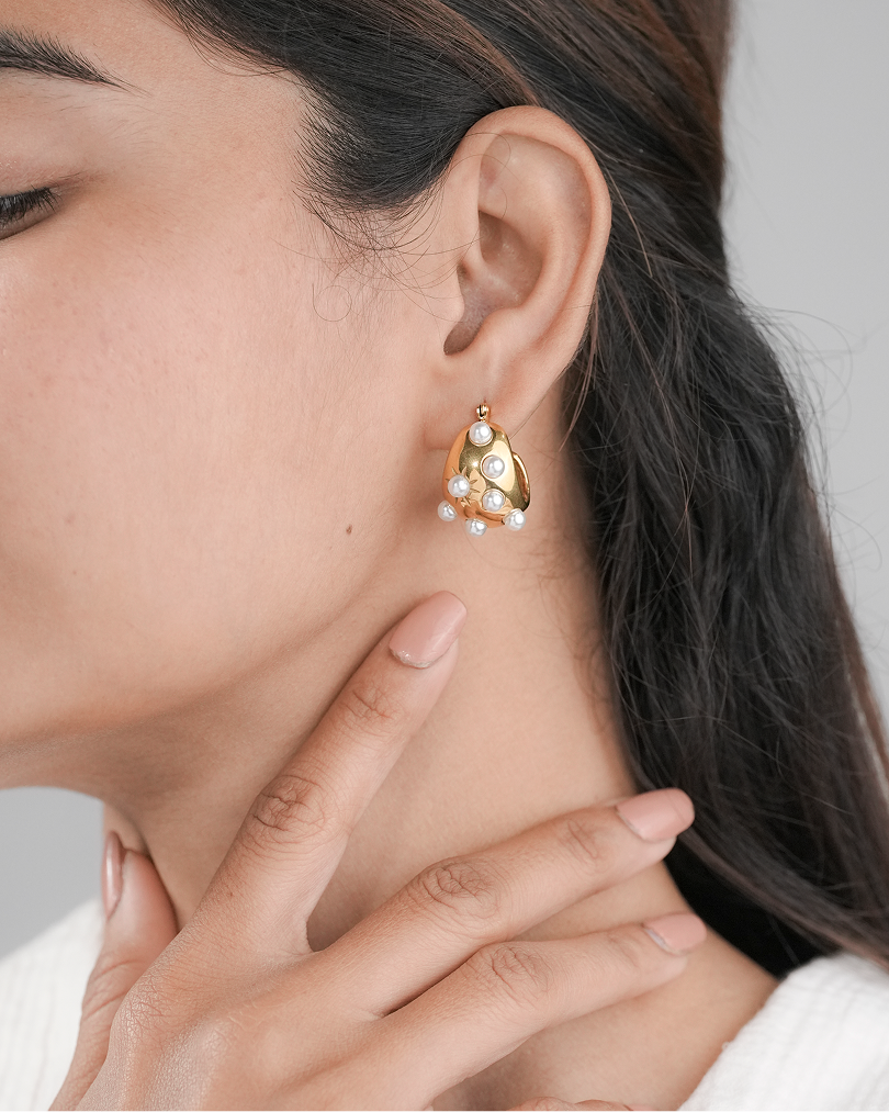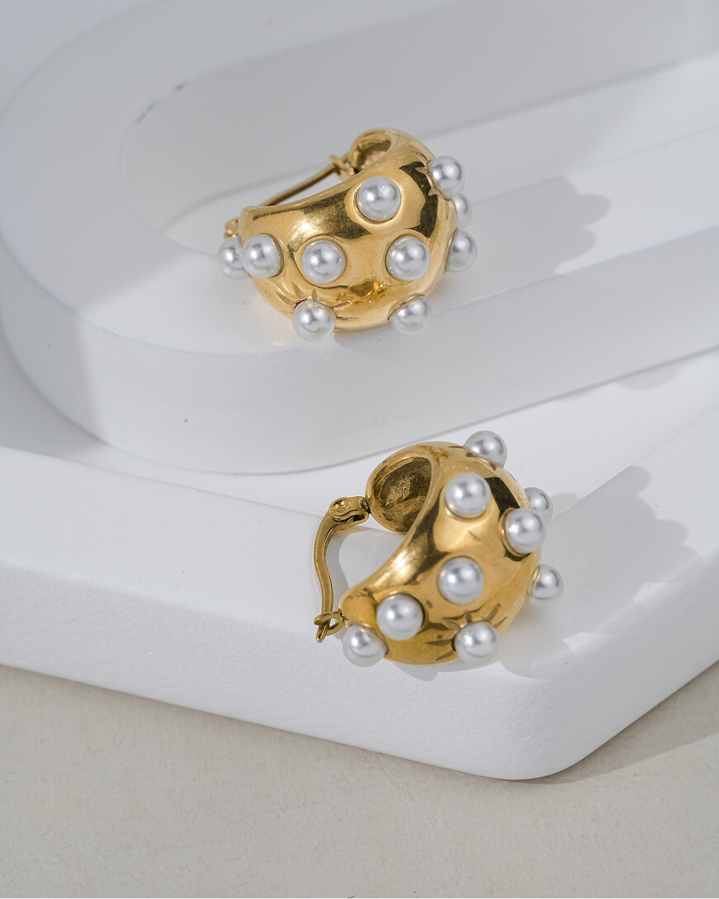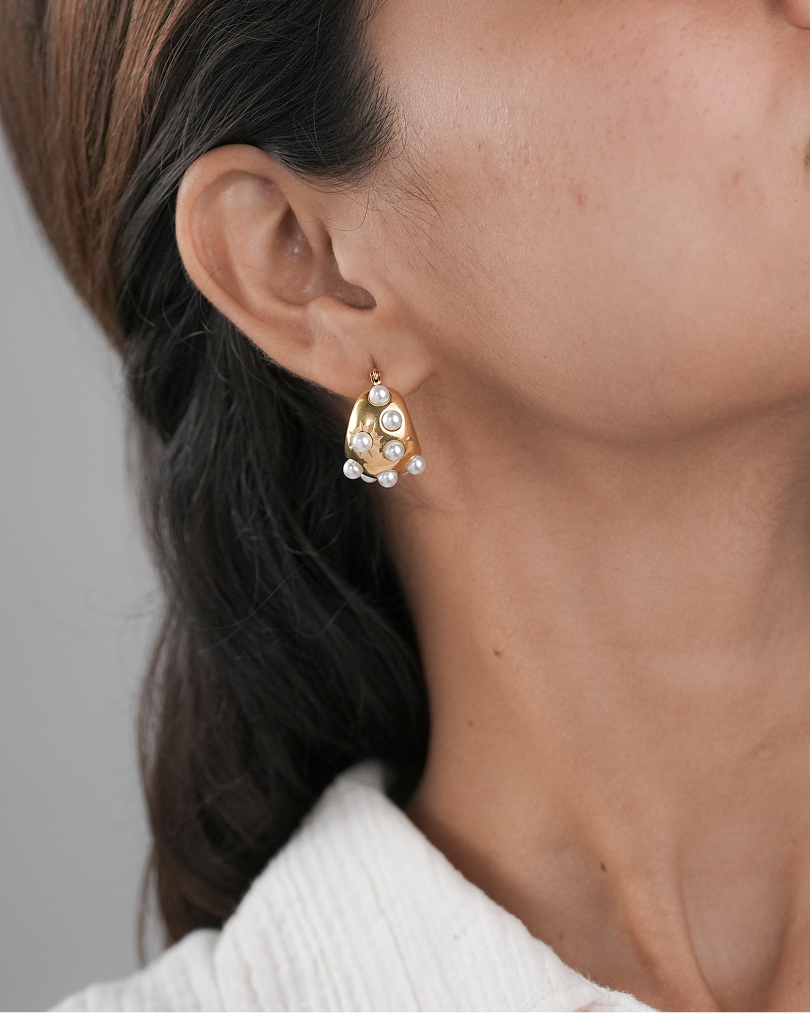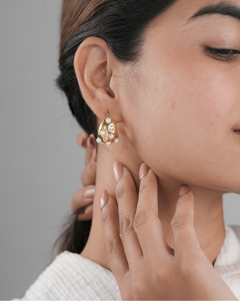 The Aurora Pearl Earrings by Zukiie Jewels are a bold blend of glamour and elegance. With a chunky gold dome base dotted with luminous pearl studs, these earrings exude vintage luxe with a modern twist.