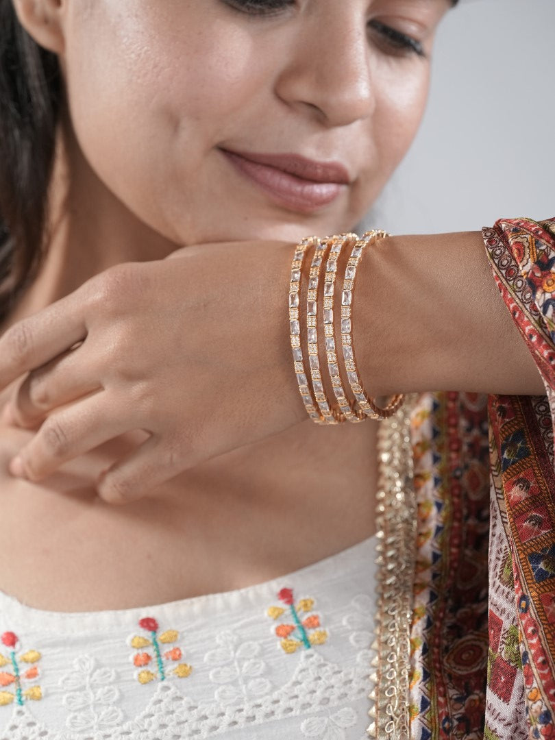A regal affair carved in gold. The Shagun Royal Bangles feature rows of baguette-cut crystals and petite diamonds meticulously aligned for a majestic, full-bodied shimmer.
