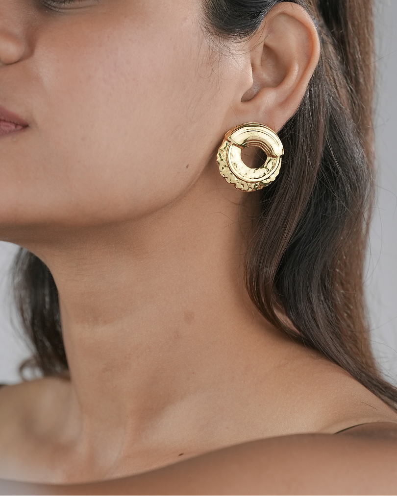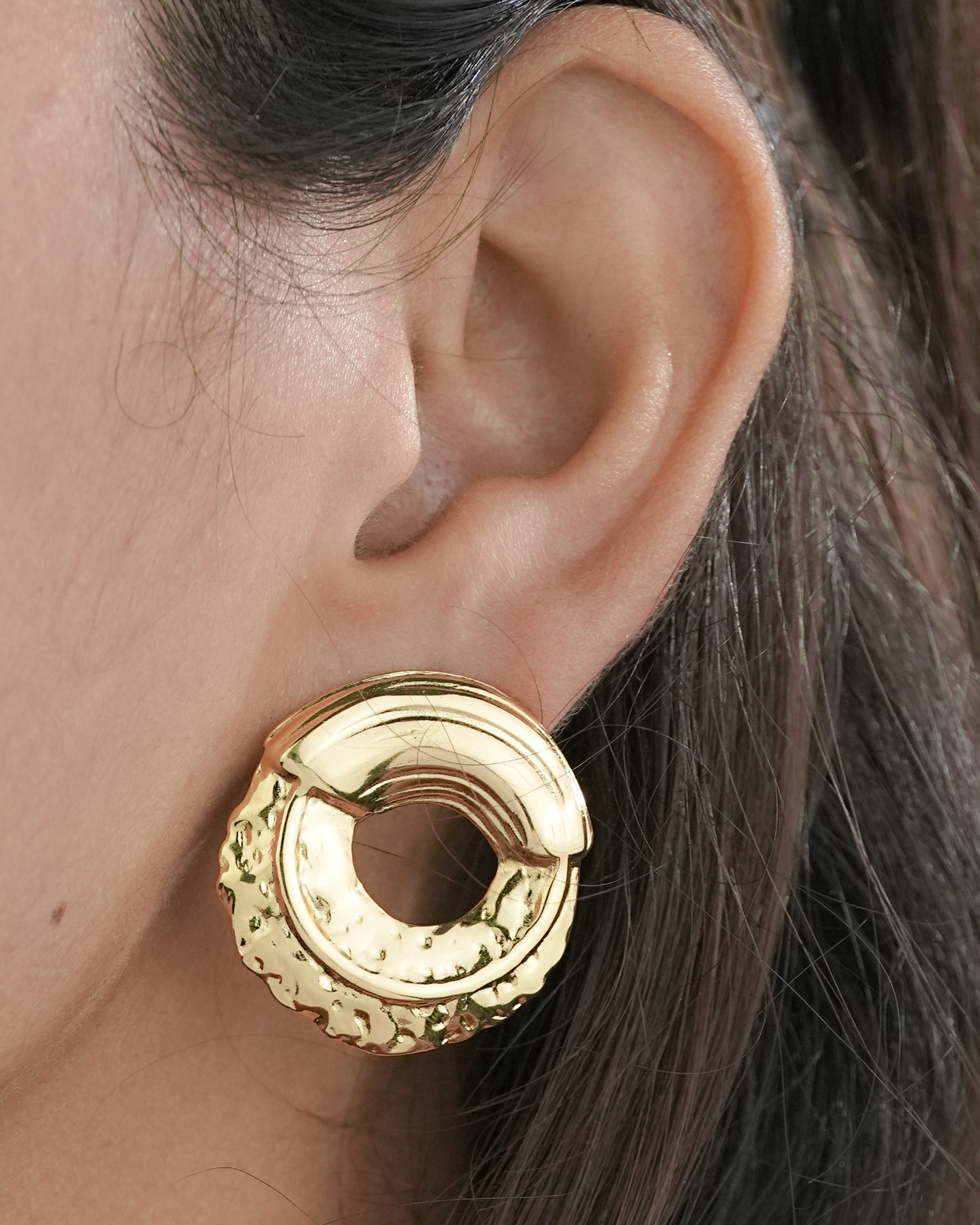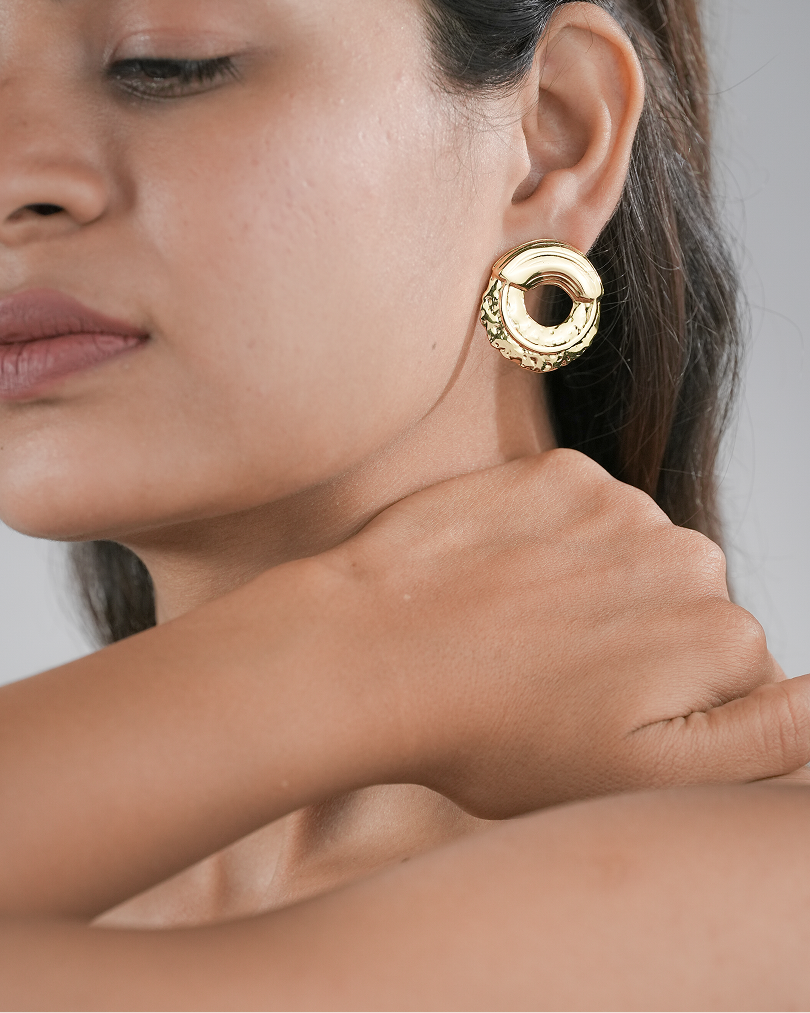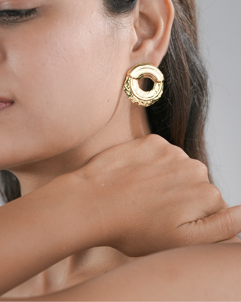 Lava Luxe earrings feature a bold circular shape with a mix of smooth and hammered textures. The design blends shine with an organic feel, making them perfect for women who love elegant statement pieces. Lightweight and easy to wear all day.