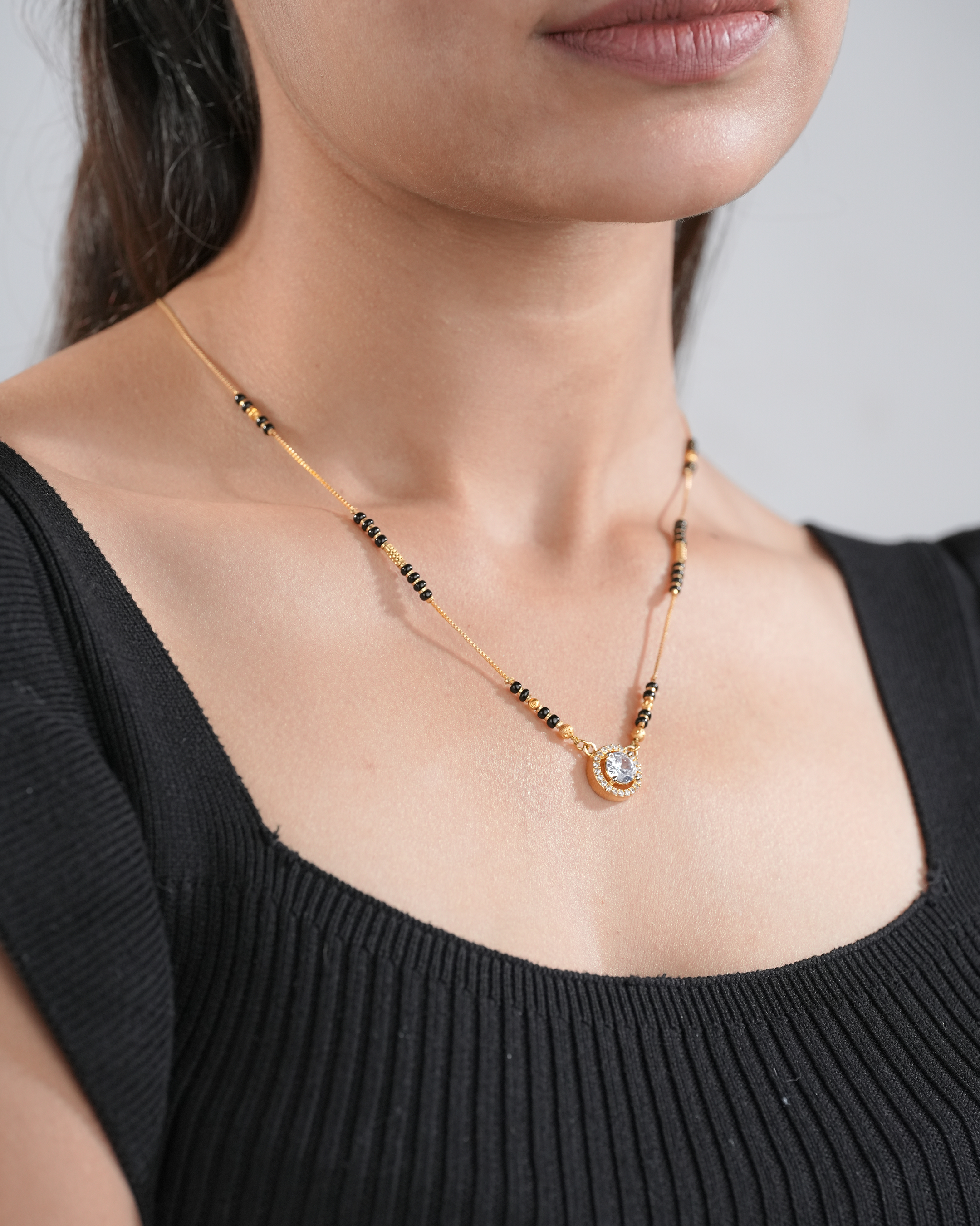 A celebration of brilliance and balance. The Oriya Shine Mangalsutra centers around a dazzling solitaire nestled in a halo of shimmering classic, radiant, and effortlessly captivating.