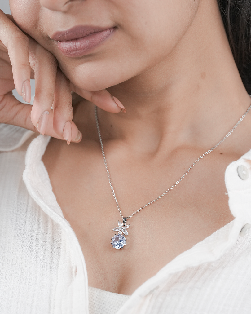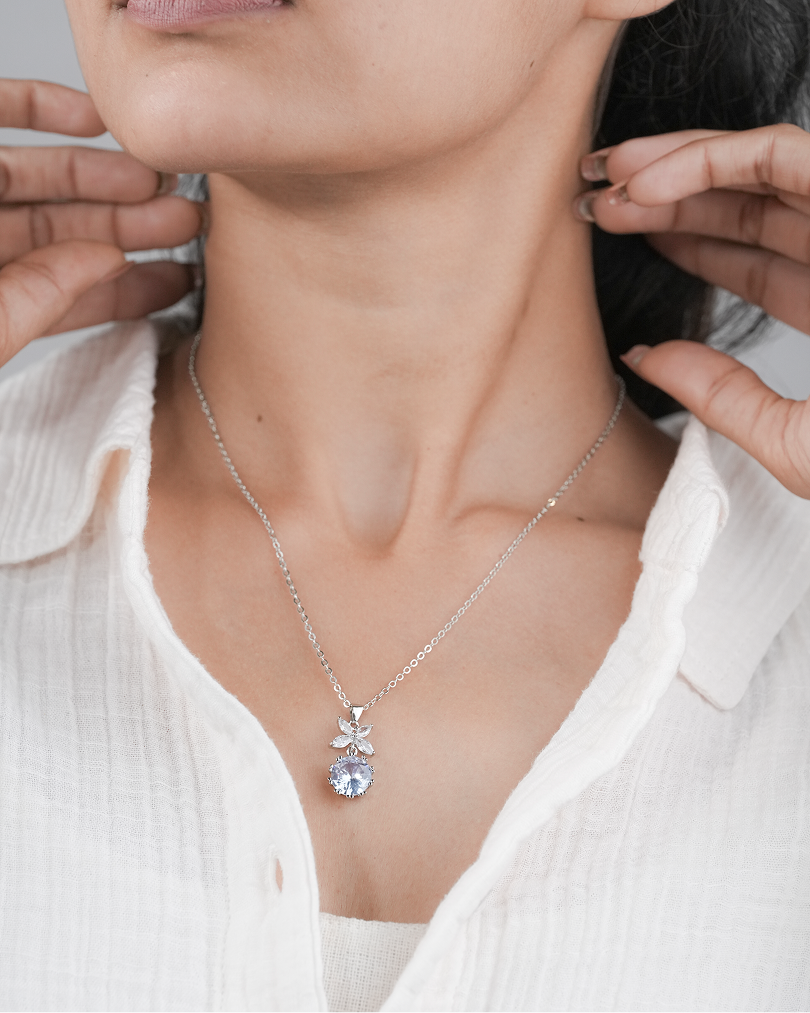 The Lavender Luxe Necklace by Zukiie Jewels is a vision of soft sophistication. Featuring a radiant lavender gemstone suspended beneath a crystal-studded floral motif, this silver-toned piece captures elegance in full bloom.