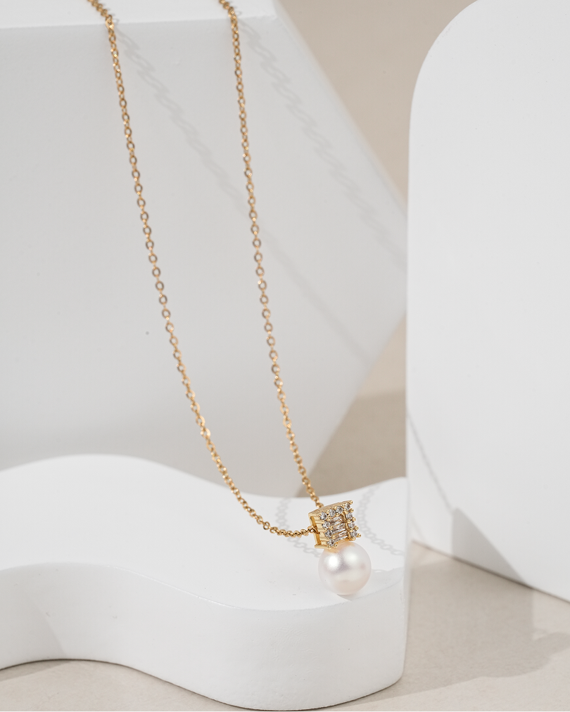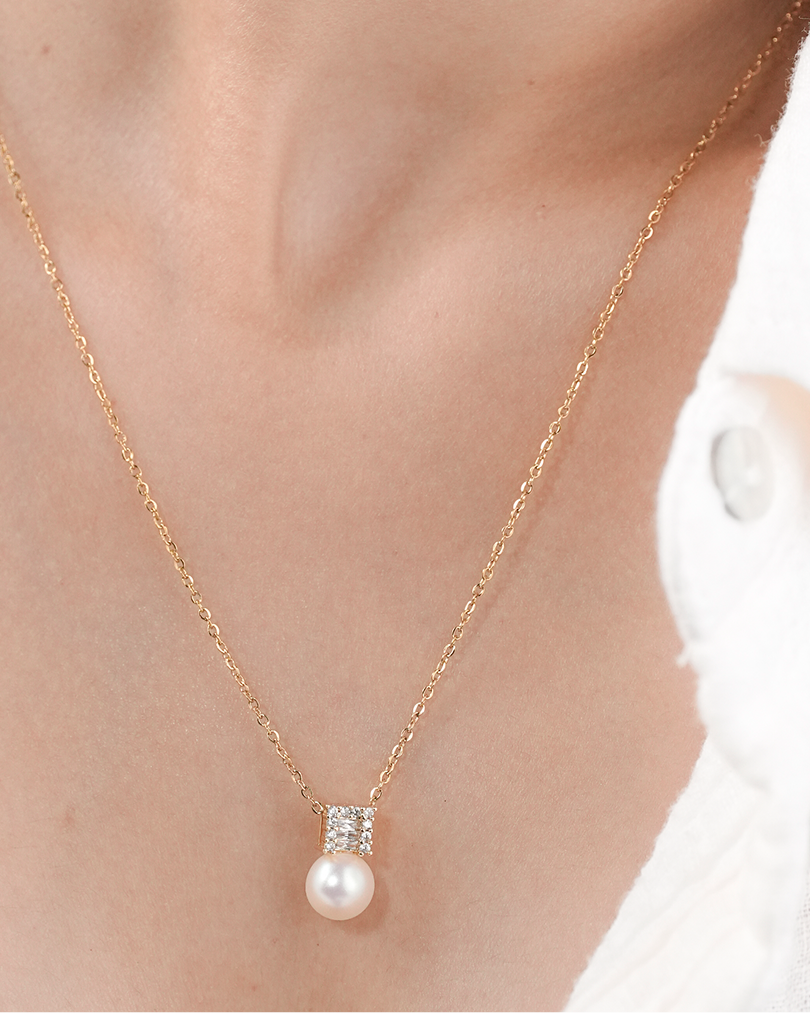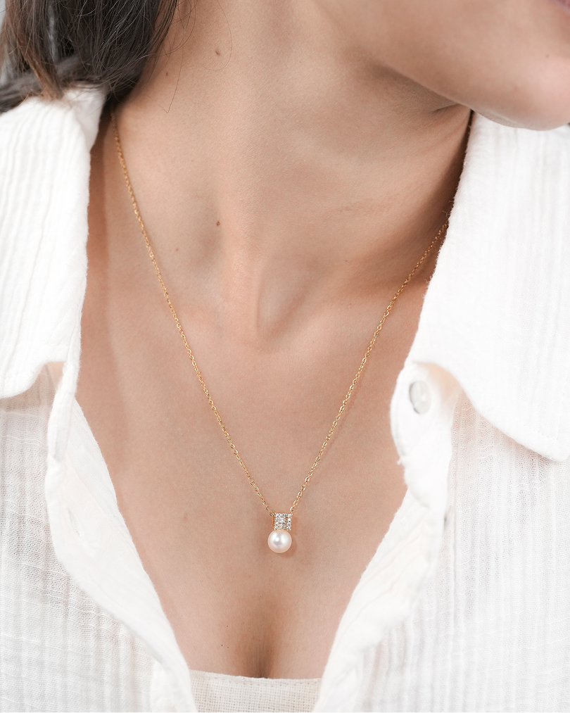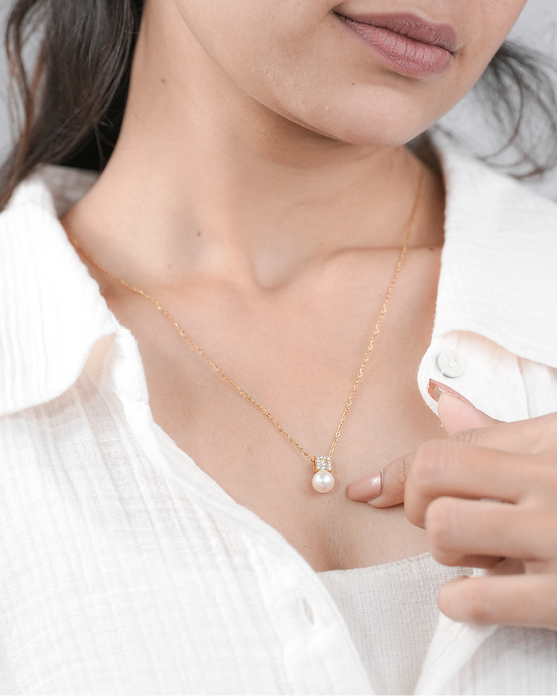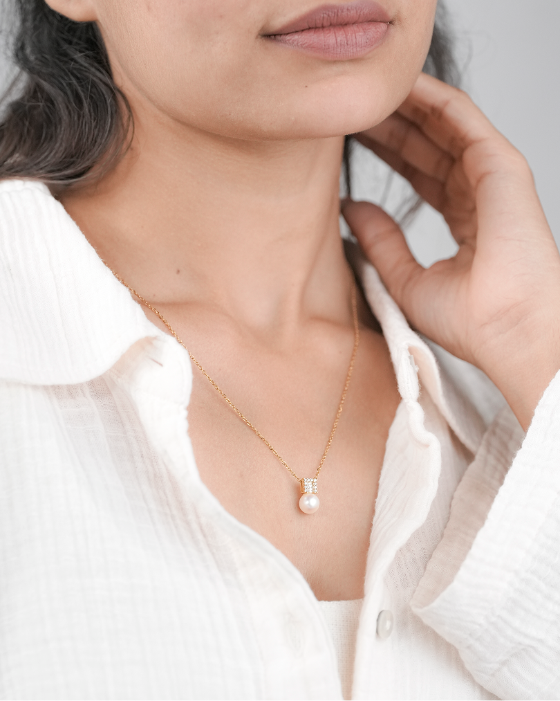 The Opaline Grace Necklace by Zukiie Jewels is the epitome of timeless sophistication. Featuring a lustrous pearl drop suspended from a crystal-encrusted gold bail, this pendant adds a refined touch to any neckline.