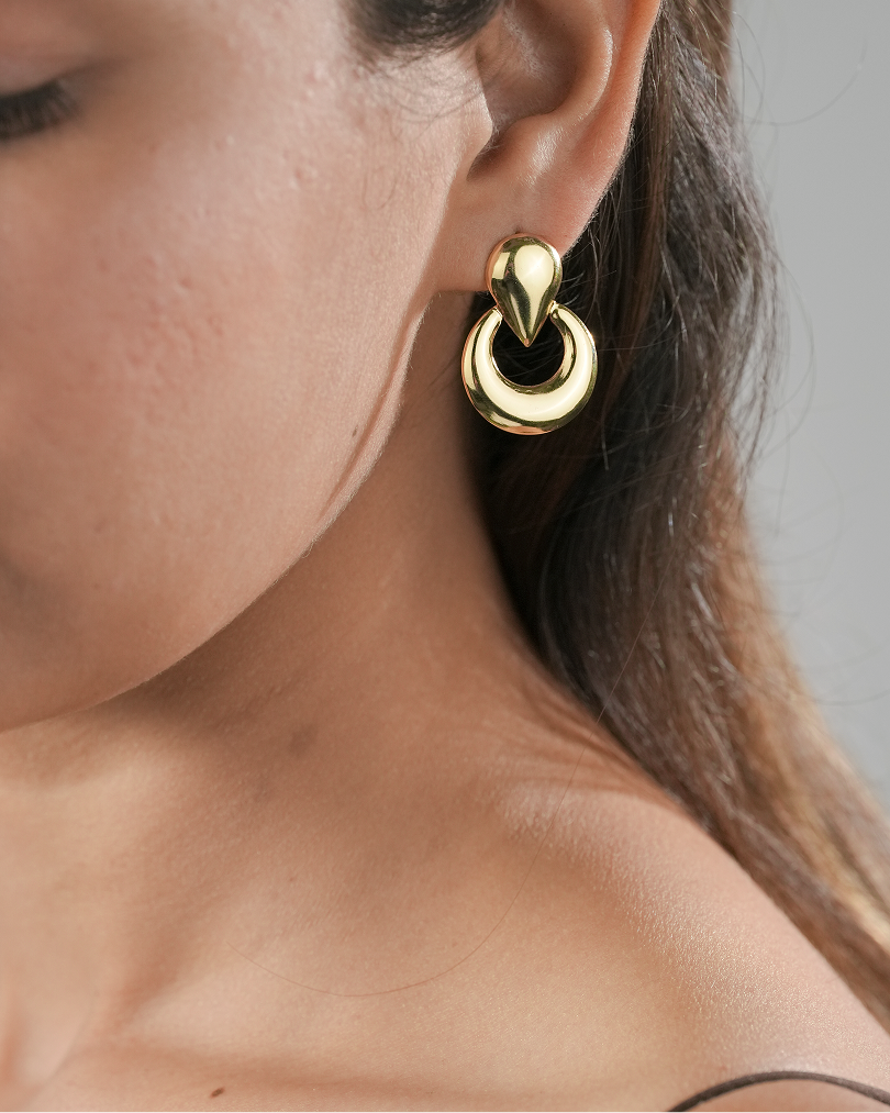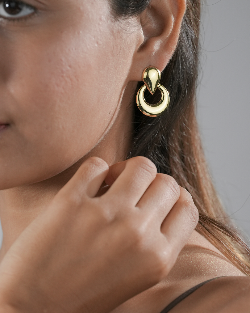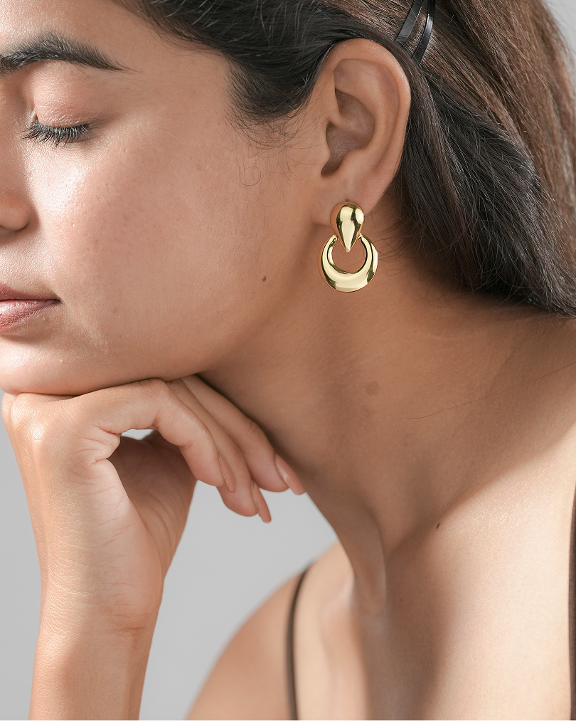 The Regal Loop Earrings by Zukiie Jewels bring a luxurious statement to everyday elegance. Crafted with a teardrop top and bold crescent loop, this polished gold piece exudes power, poise, and a hint of vintage drama.